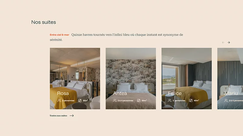 Avec tous ces éléments en main — palette, typographies, motifs, pictogrammes, écriture, noms de suites — le webdesign a pu être mené de manière cohérente et ambitieuse. Pas de bricolage, pas de compromis. Chaque page a été repensée pour mettre en avant l'expérience, les services, l'atmosphère de l'établissement.